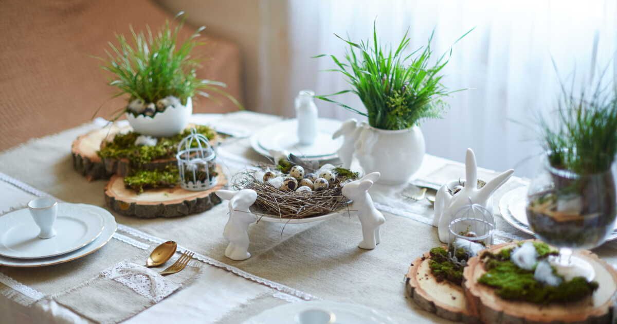 Célébré au printemps, Pâques est l’occasion d’incorporer des éléments naturels sur votre table. Utilisez des branches en bois, de la fausse herbe pour un centre de table dynamique, et n’oubliez pas les fleurs fraîches ! Des tulipes, des roses ou des jonquilles apporteront une touche de couleur. Adoptez des porte-serviettes ludiques en utilisant du bolduc vert et des fleurs pour une décoration vivante.